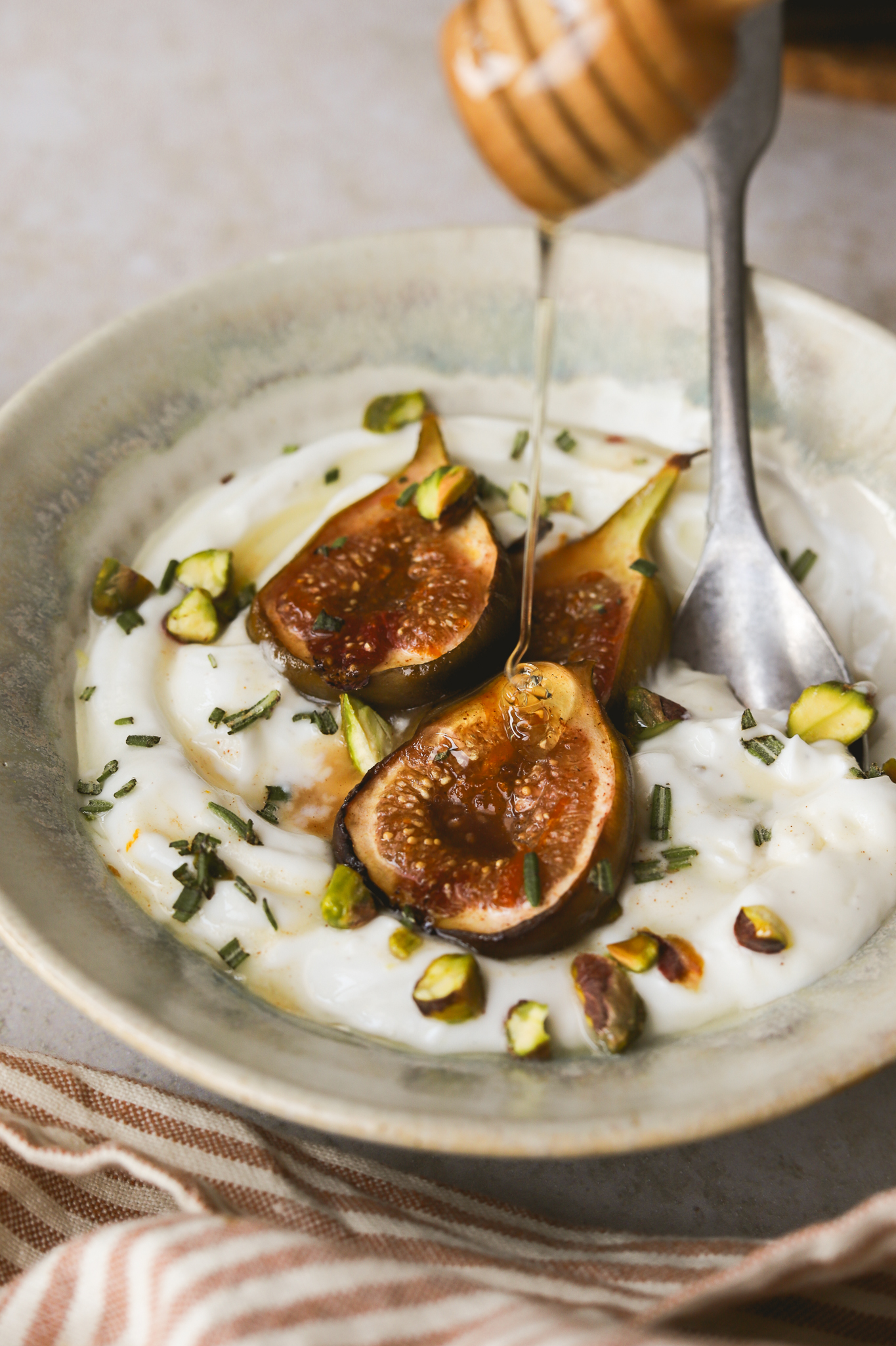 Step 6: Serve fig halves on Greek yogurt or mascarpone with a drizzle of the syrup from the baking dish, fresh minced rosemary or thyme, chopped pistachios and another drizzle of honey if desired.